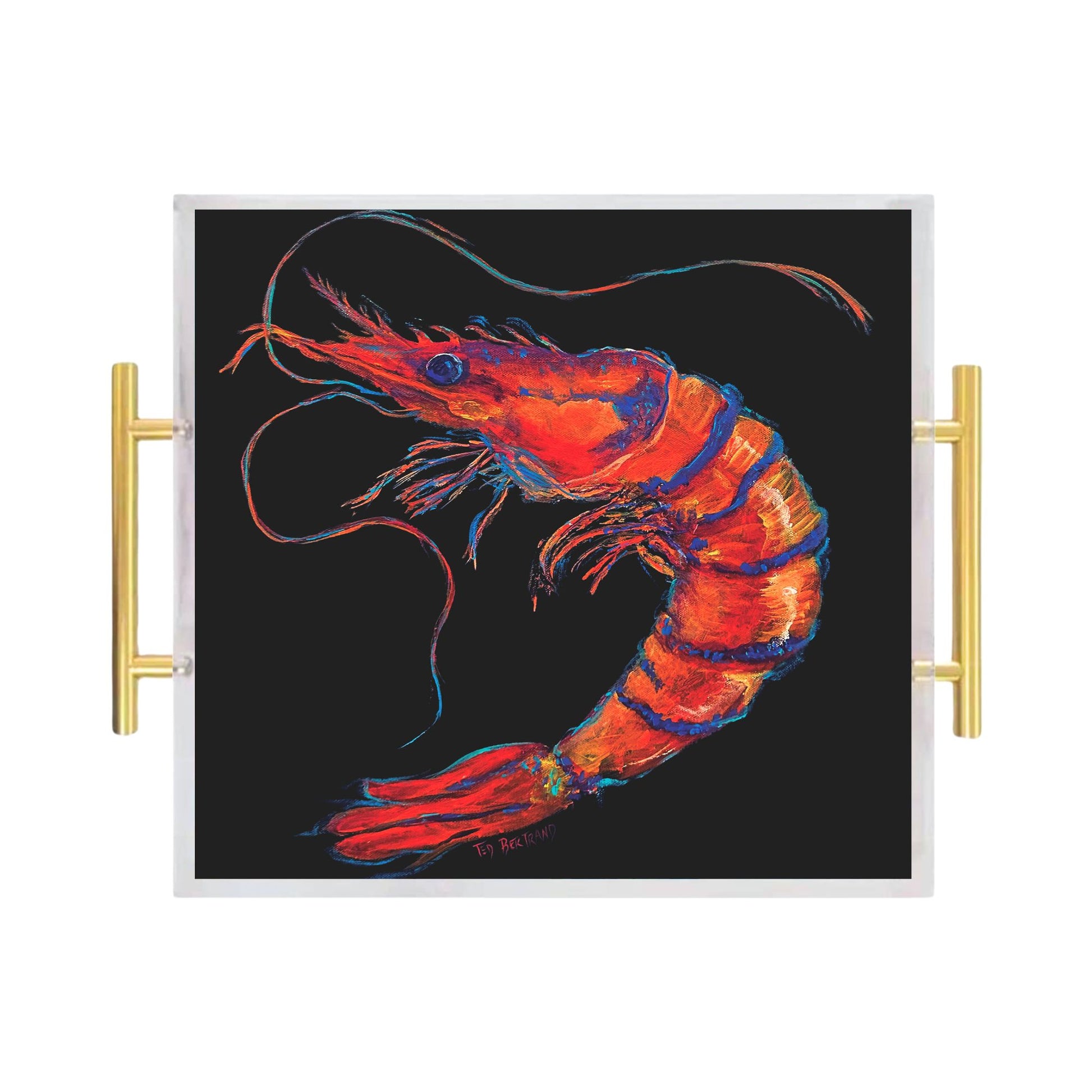 Enhance your space with the beauty of this striking acrylic tray, featuring the artwork "Spotlight Shrimp" by Louisiana artist Ted Bertrand!