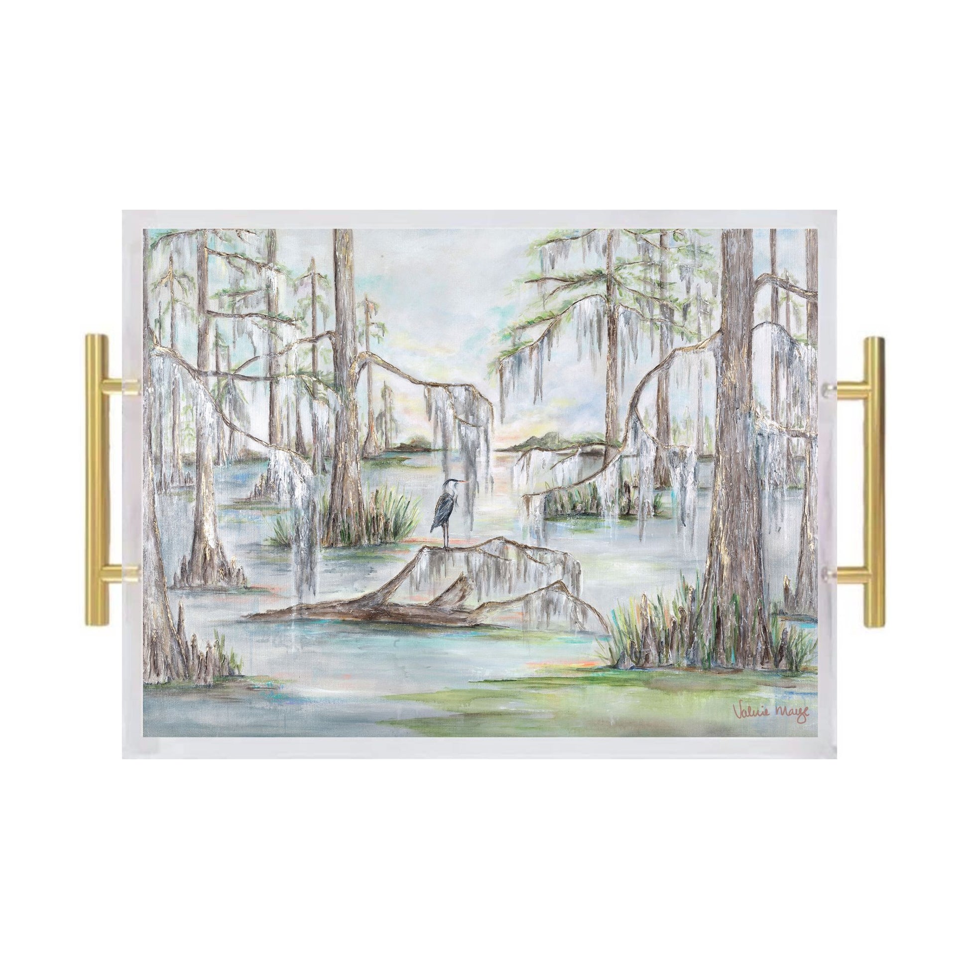 Enhance your space with the beauty of this striking acrylic tray, featuring the artwork "Sunset Heron" by Louisiana artist Valerie Marze!